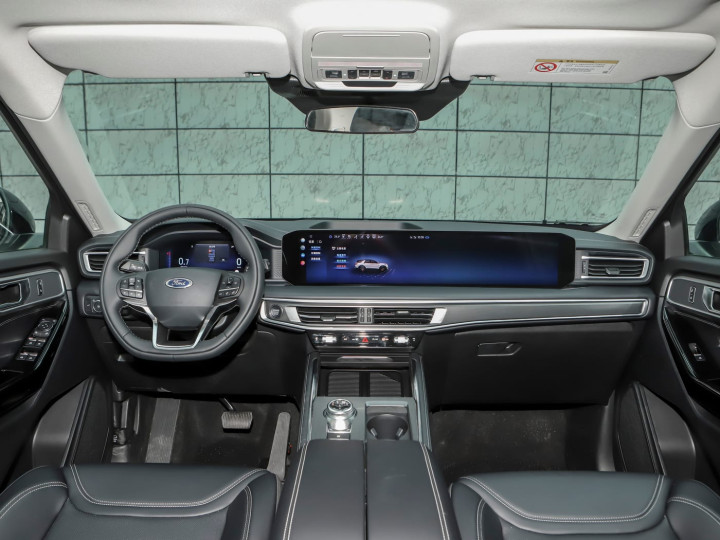进入车内,厚重的中控台配备有27英寸4K中控横屏与12.3英寸全液晶仪表构成视觉焦点,SYNC+2.0系统支持三指飞屏操作。中控台保留实体旋钮,木纹饰板与真皮缝线营造出美式豪华特有的层次感。新款福特探险者四驱穿越版采用2+3式5座布局,也是探险者家族唯一5座车型,而之前车型有着六座版,第二排配备独立座椅扶手,第三排腿部空间达820mm。后备箱常规容积为515L,放倒座椅后可扩展至2487L,但地台高度达720mm影响搬运便利性。在配置方面,新款福特探险者四驱穿越版搭载了前排侧安全气囊、前后排贯穿式侧气帘、胎压监测、后排隐私玻璃、电动尾门、无钥匙进入、三区自动空调、后排空调出风口、ANC主动降噪、全景天窗(带电动遮阳帘/防夹功能)
