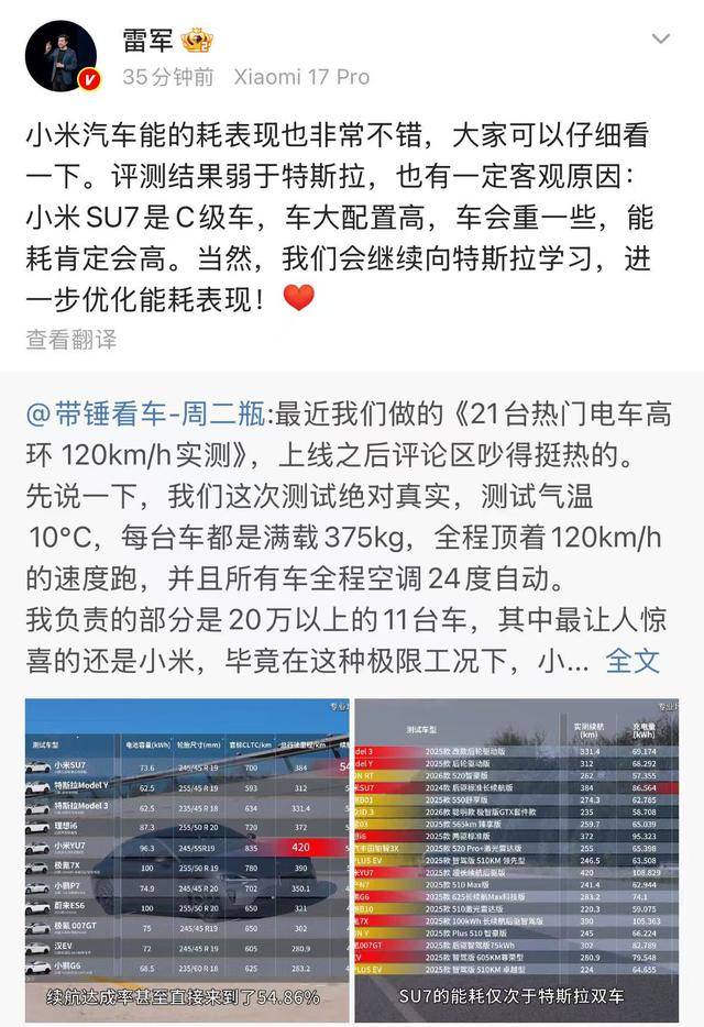 小米董事长兼CEO雷军近日在社交平台公开回应了外界对小米汽车能耗表现的关注。他坦言,小米SU7作为一款C级豪华轿车,因车身尺寸较大、配置丰富导致整备质量偏高,能耗表现虽略逊于特斯拉,但这一差距存在客观因素。雷军同时表示,小米将持续向行业标杆特斯拉学习,通过技术迭代进一步优化能耗管理。
