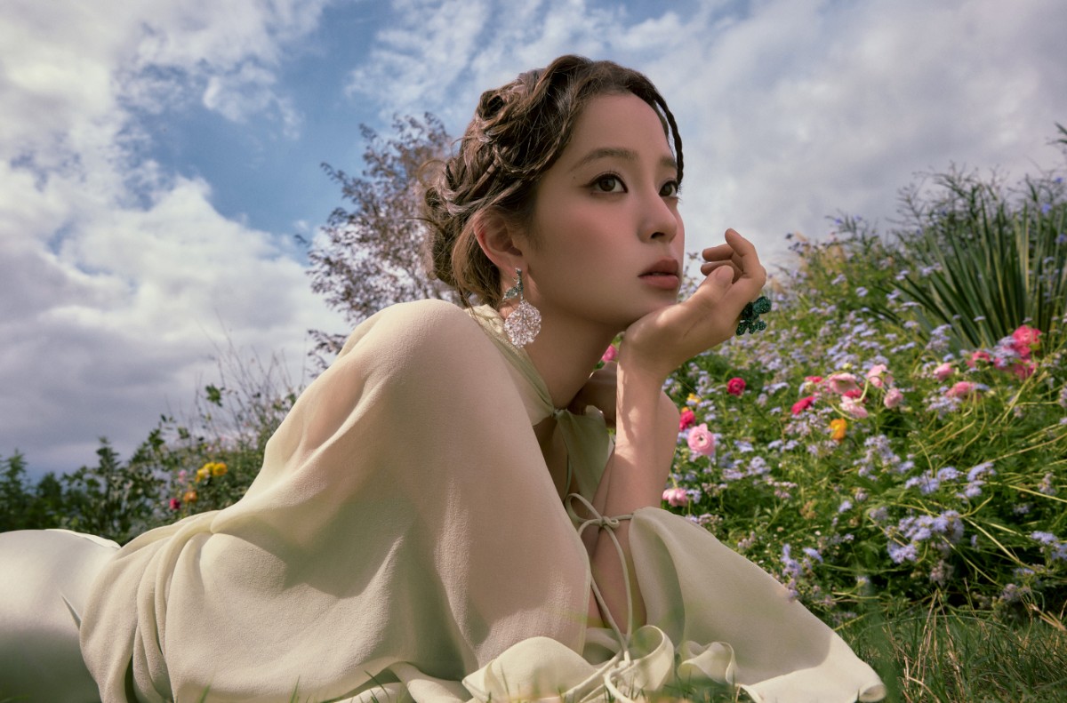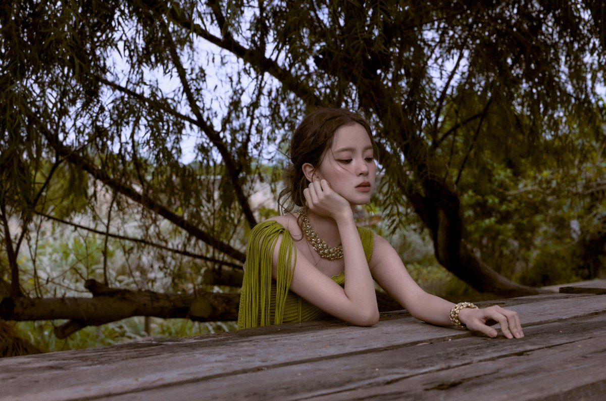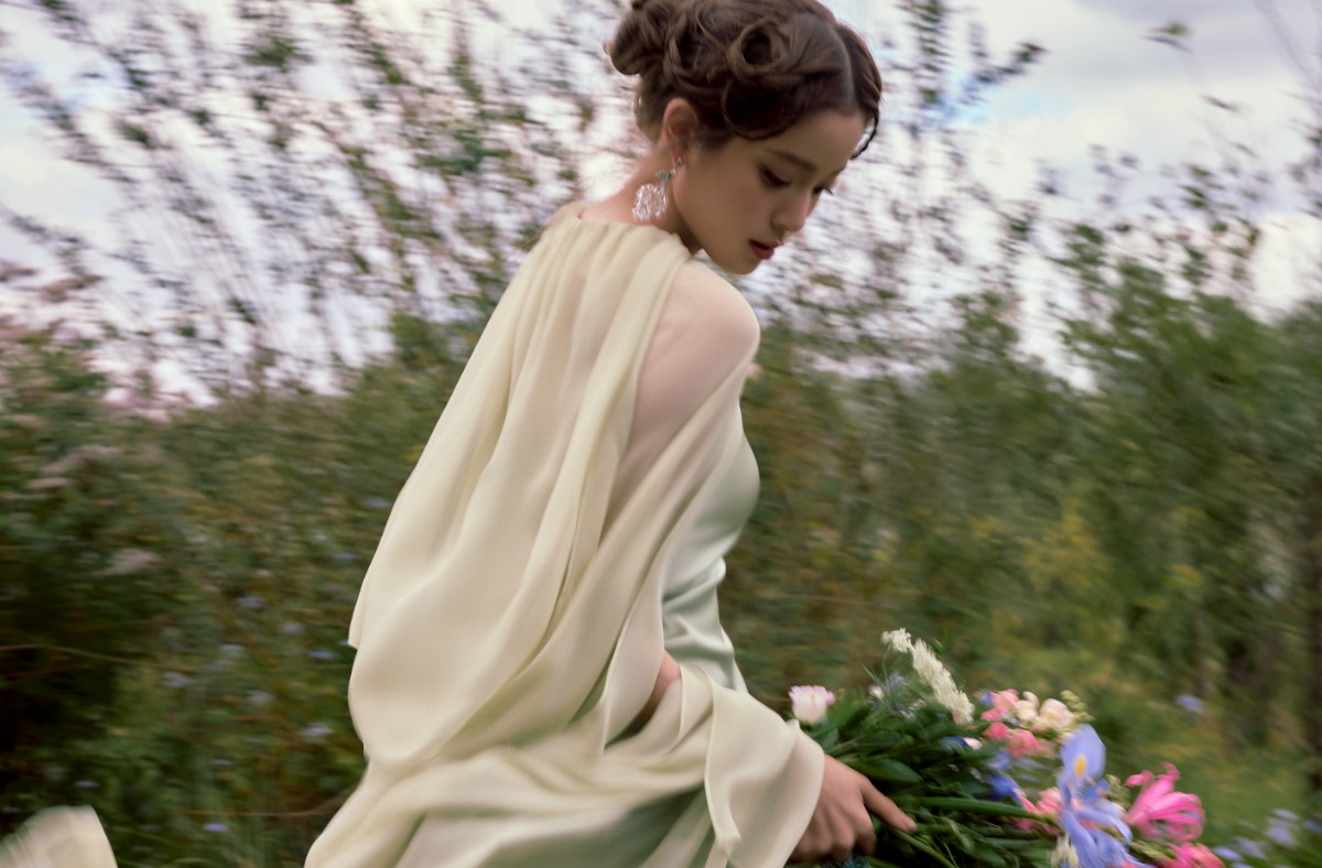 不同于常规红毯出发图的棚拍套路,这组照片选在郊野取景:繁花丛中她侧卧于草地,仰头时裙摆与花海交织成画;林间木桌旁,她托腮凝望,柳枝在身后晕出朦胧的绿意…… 这种“把时尚扔进自然”的拍摄思路,打破了红毯=华丽舞台”的固有认知,让欧阳娜娜仿佛从莫奈画里走出来的精灵,每一个画面都透着人景相融的诗意。